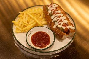 Özel kesim hot dog ekmeği, Tütsülenmiş sosis, Salsa sos, Tatlı turşu, Gravy sos....