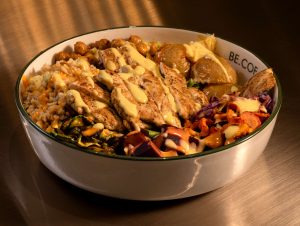 Izgara Tavuk, Iceberg Salata, Çeri Domates, Rende Bergama Tulumu, Simit kruton, Şefin Sosu....