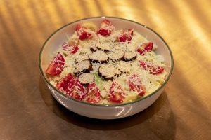 Iceberg salata, Çeri domates, Rende Bergama Tulumu, Simit kruton, Şefin Sosu....